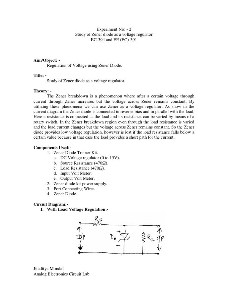 Experiment 1 Aim 1 To Study Zener Diode As Voltage Regulator 2